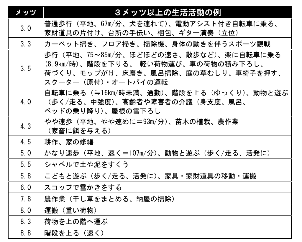 これらを細切れの時間でもよいので「週23メッツ・時以上」行うと、推奨される身体活動量に達するのですが、皆様はいかがでしょうか?